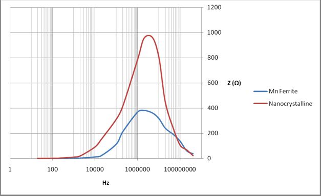 The graph below shows the Impedance |Z| versus Frequency for Common Mode Chokes based on ferrite core and that of nanocrystalline core. The size of the 2 cores is the same, and the number of turns and wire size are exactly the same.