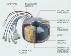 Toroidal Power Transformers are made with tape wound cores. The tape wound cores provide an almost perfect magnetic circuits to minimize losses, fringing, leakage, distortion, and provide good magnetic shielding. It also decreases the magnetization force required to produce a given flux density. It is much more efficient than E-type lamination cores, but will have somewhat higher cost as the windings need to be done on the core itself, rather than on a bobbin. The tape material is made of insulated, high permeability silicon iron, with a typical thickness of 4 mils ( 0.004"). Other materials types such as 50% nickel iron alloy, Molybdenum permalloy or supermendor are also available with increased cost. Coil Winding Specialist (CWS) has designed a series of low cost standard tape wound transformers as shown in the table "Toroidal Power Transformer - How to order ". All these transformers are designed to meet all international safety requirements ( UL, CSA, TUV, etc). Customer can order these standard transformers in small quantities for testing and prototyping. Please click on the link below to view the complete specifications and standard off the shelf parts and ordering infromation.